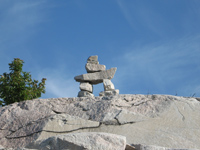 | The Nunavut flag is dominated by a red inuksuk. An inuksuk is a stone monument made by Inuit people as landmarks when traveling through the barren and snowy tundra. It is red to represent Canada. The blue star in the upper right of the flag represents Niqirtsuituq (the North Star) and the leadership provided by the Inuit elders. The colors yellow and blue represent the riches of the land, sea, and sky. |